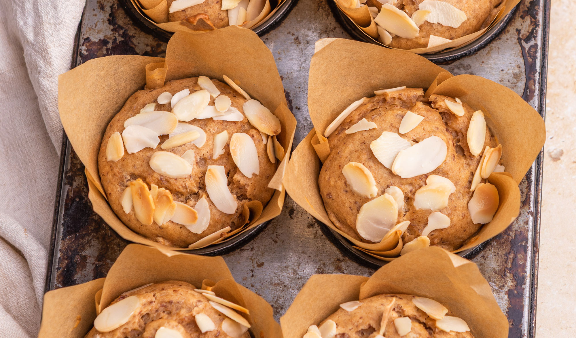 7. Sprinkle each muffin with flaked almonds, then bake for 20 minutes or until golden, risen, and a skewer inserted into the centre comes out clean.