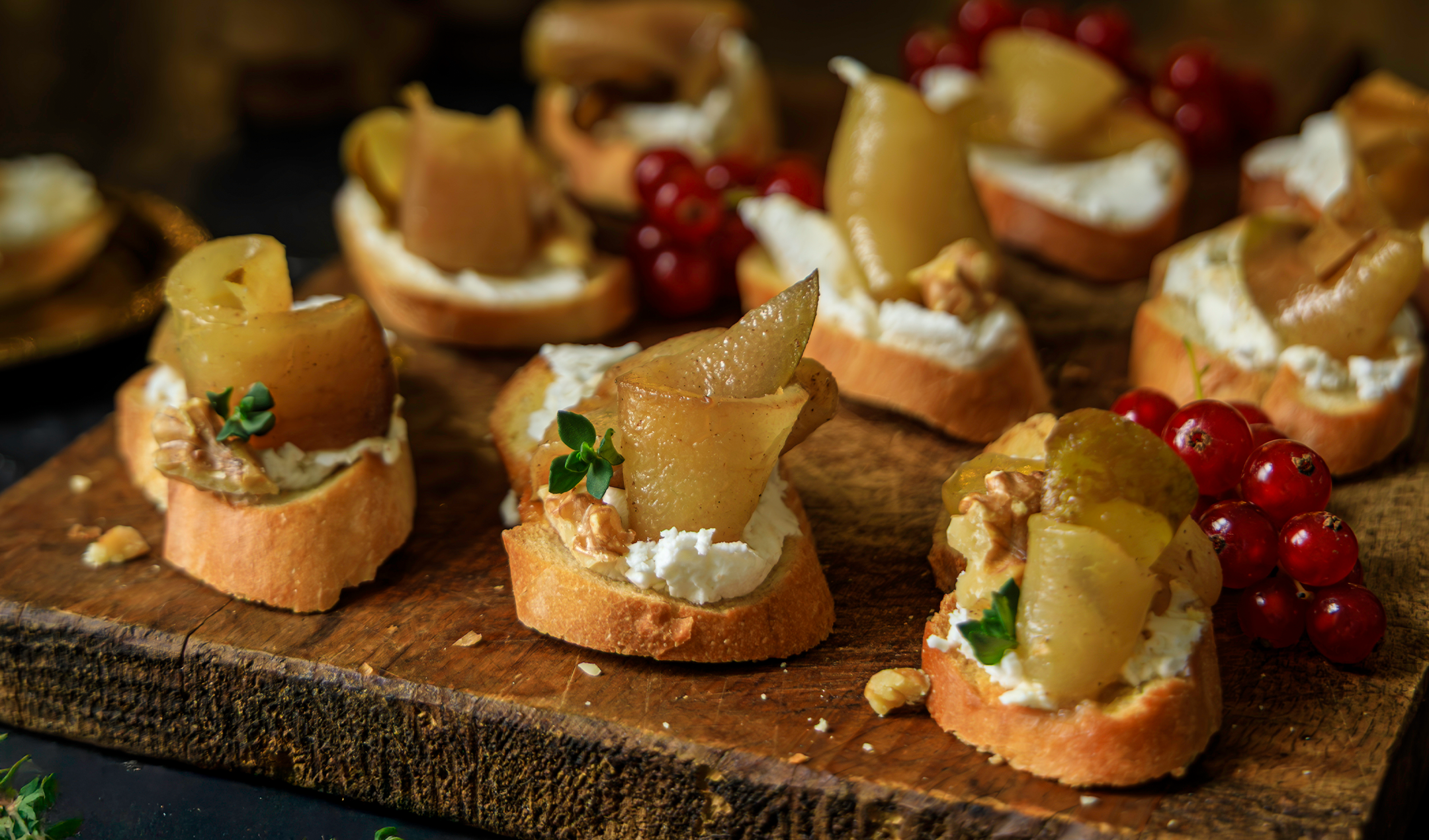 - To assemble the crostinis, spread a tablespoon of goat’s cheese onto each baguette slice, top with a slice or two of caramelised pear, drizzle over some honey and top with a few chopped walnuts.