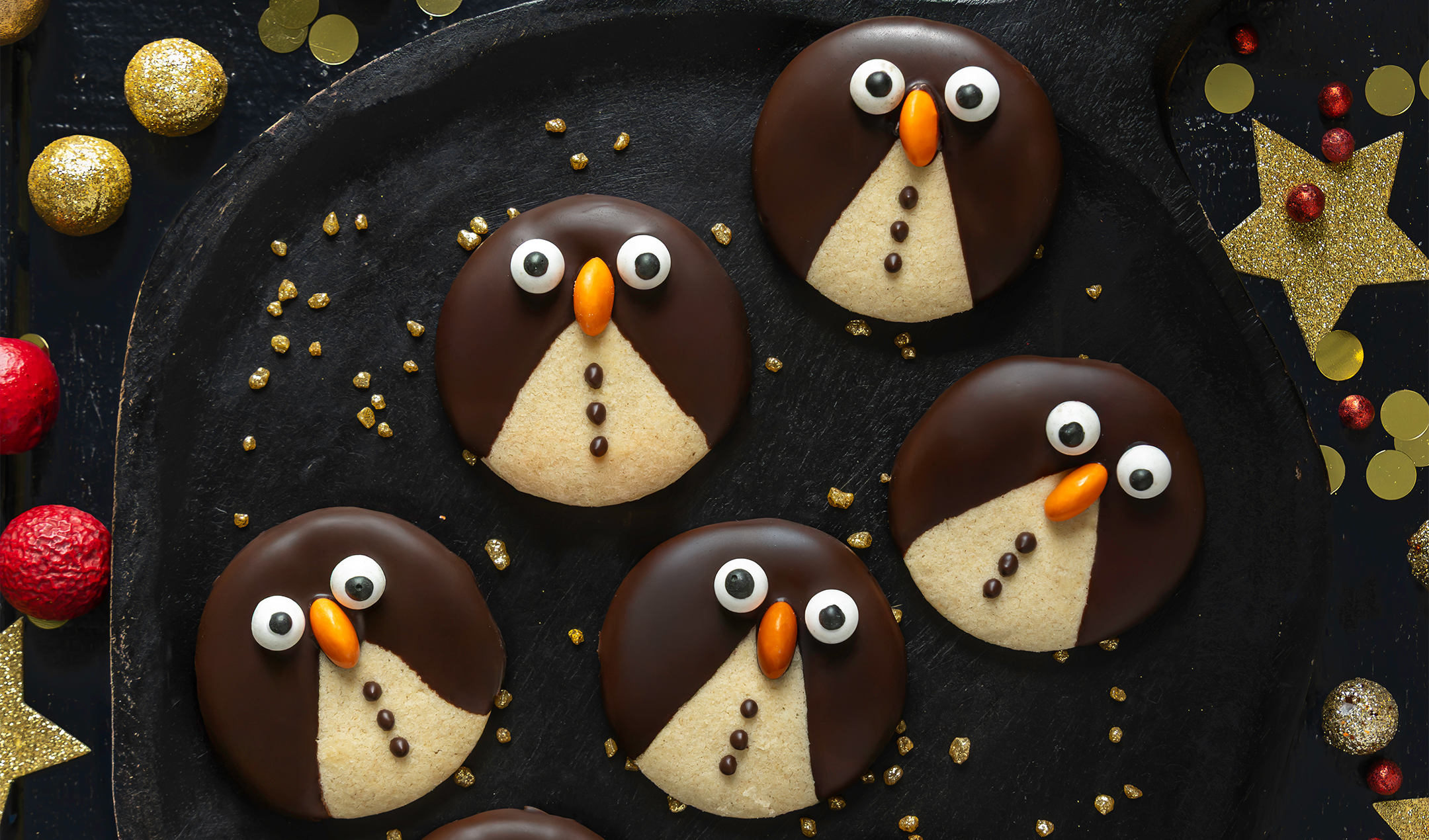 - While the biscuits are setting, pour the remaining melted chocolate into a sandwich bag, pushing it into the corner of the bag. Using scissors, cut a tiny hole in the corner, and pipe three little dots in a line onto the uncovered part of each cookie. Above the three dots, place two decorative eyes (or white chocolate chips with a dot of milk chocolate in the middle) and half an orange Smartie, to act as the penguin’s eyes and nose.