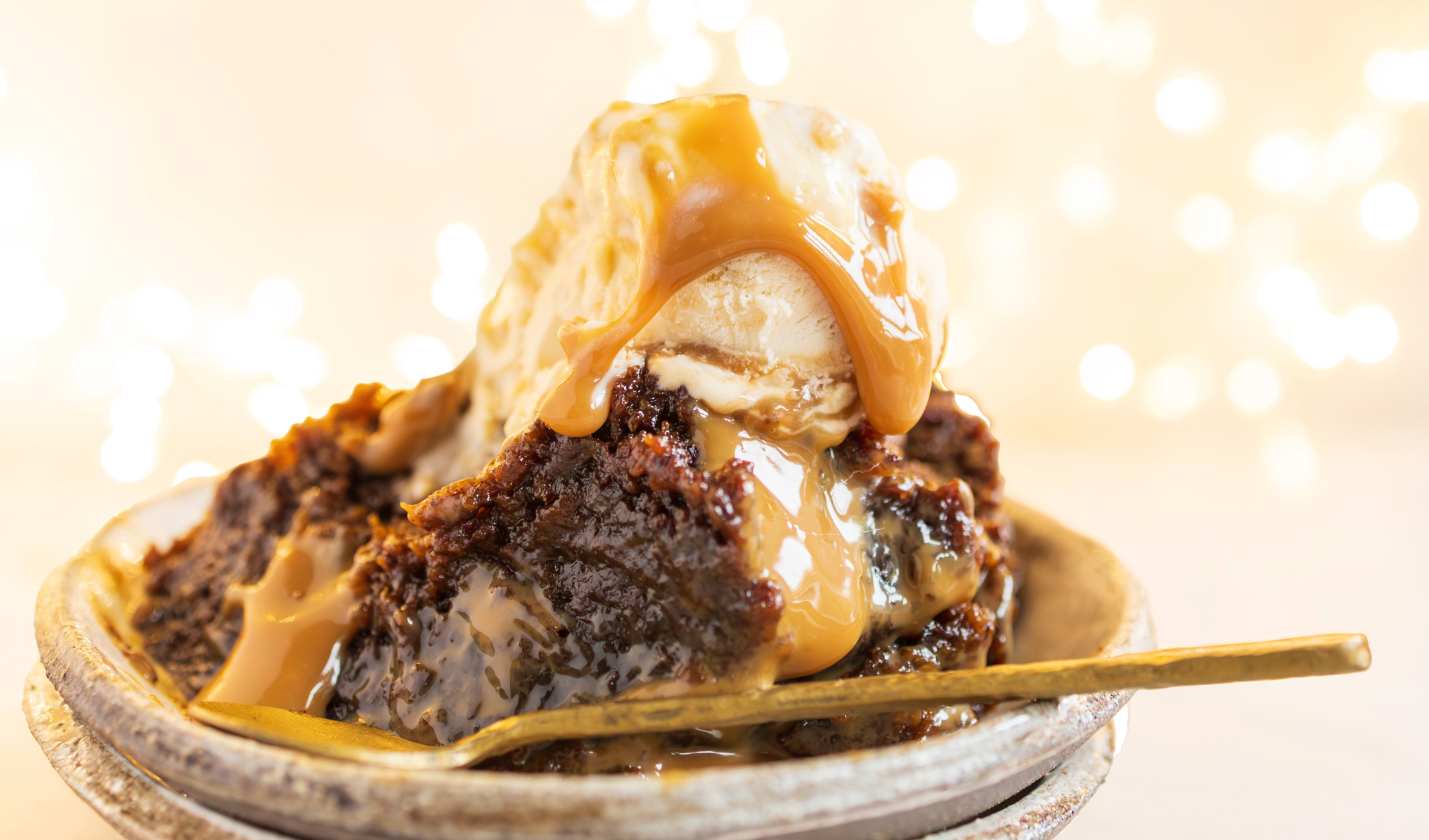 - To serve, cut a wedge of the pudding, pour over the toffee sauce and serve with a scoop of ice cream and extra toffee sauce.