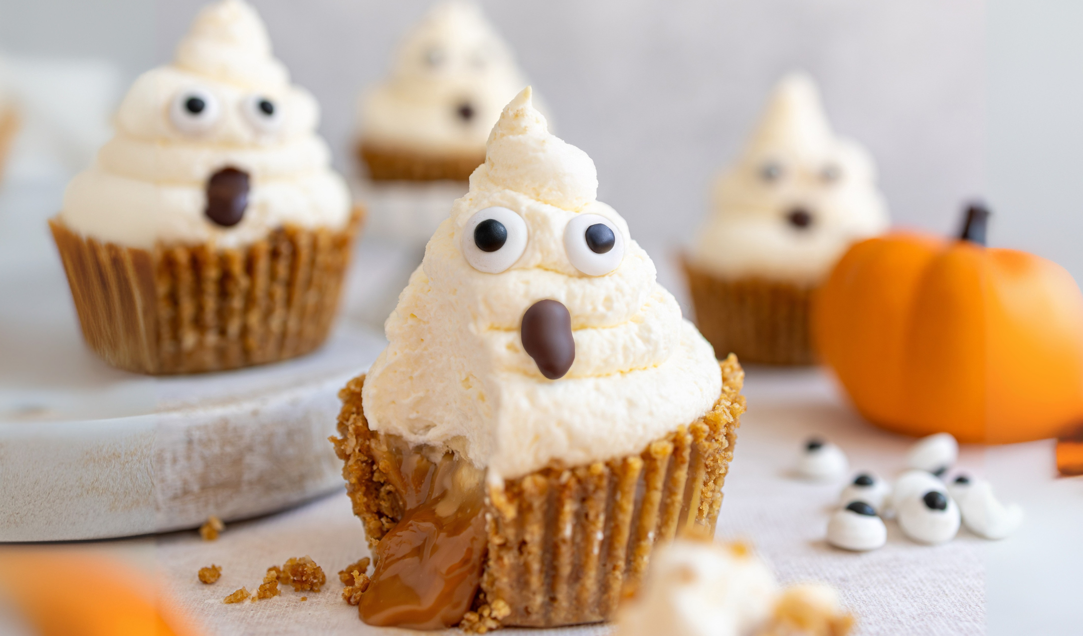 - Using a toothpick and melted dark chocolate, draw the eyes and mouth onto the cream to make little ghost faces.