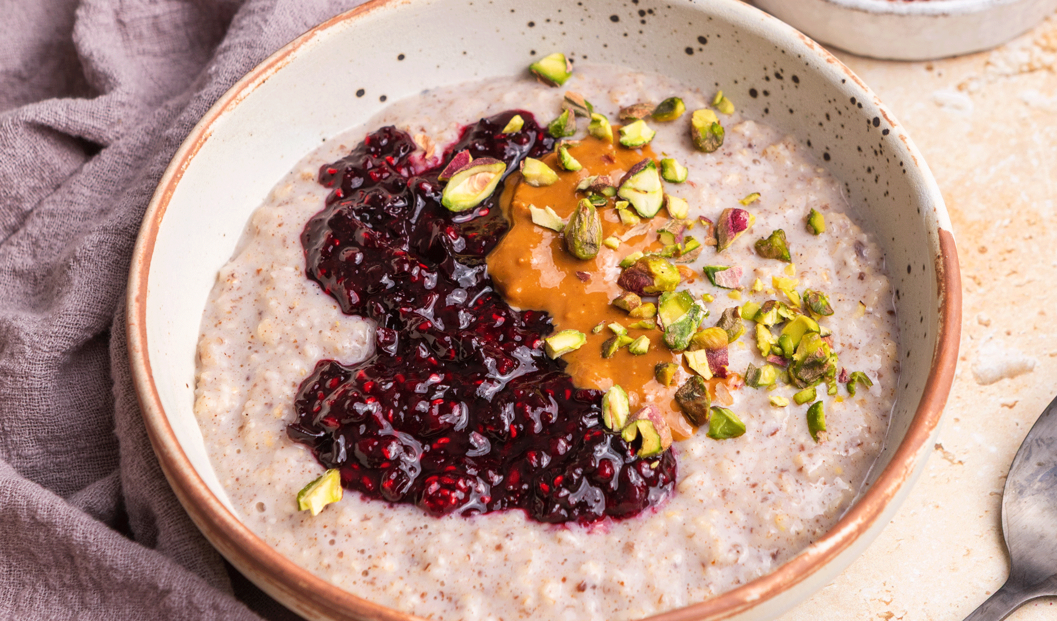 3. Spoon the warm porridge into a bowl. Swirl through the berry compote, then top with peanut butter, chopped pistachios, and an extra drizzle of honey or maple syrup.