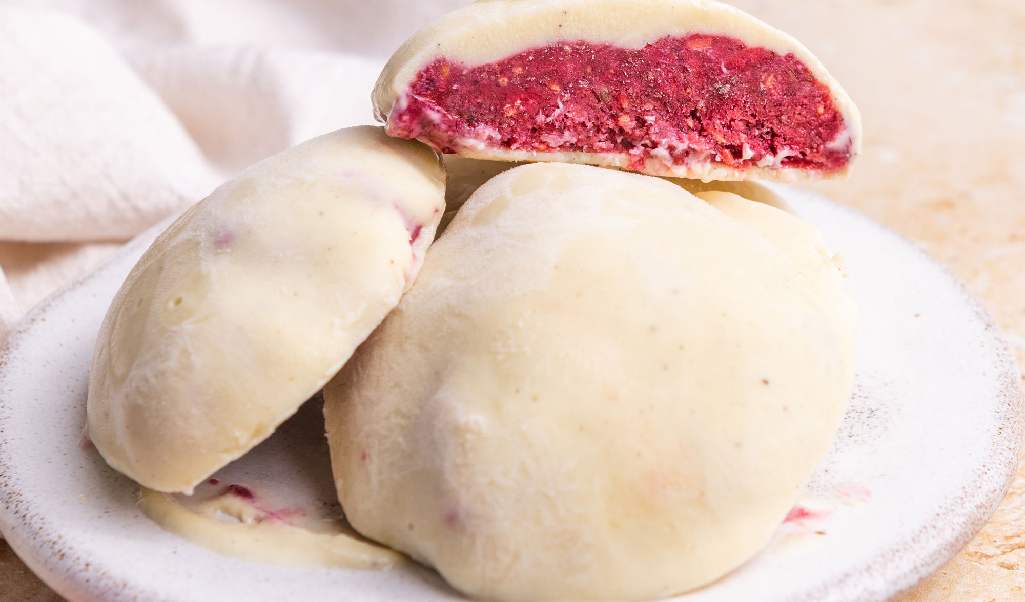 - Line a baking tray with parchment paper. Spoon 4–6 mounds of the raspberry flax jam onto the tray and place in the freezer for at least 2 hours, until fully frozen.